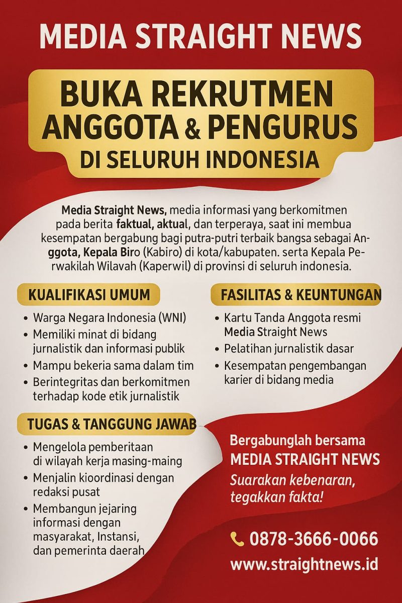 JAKARTA – Media Straight News, media informasi yang berkomitmen pada berita faktual, aktual, dan terpercaya, saat ini membuka kesempatan bergabung bagi putra-putri terbaik bangsa sebagai Anggota, Kepala Biro (Kabiro) di Kota/Kabupaten, serta Kepala Perwakilan Wilayah (Kaperwil) di Provinsi di seluruh Indonesia.